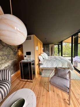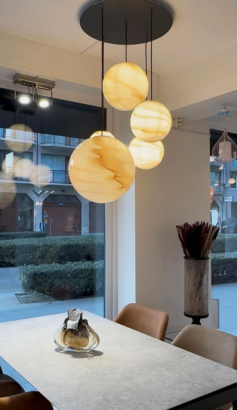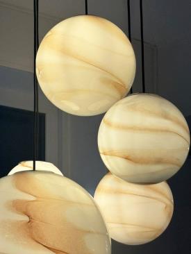 Les grands globes de verre diffusent une lumière douce et enveloppante, tandis que le marbre naturel apporte une présence minérale, subtile et raffinée.