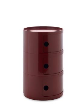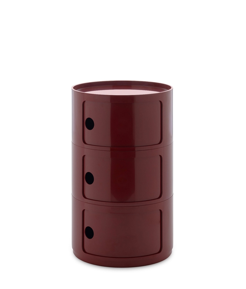 Présentés ici dans une version ronde de 42 cm, les Componibili d’Anna Castelli Ferrieri apparaissent sous un jour totalement nouveau. Une nouvelle apparence obtenue en utilisant un nouveau moule industriel qui met en valeur sa qualité et son esthétique. La palette s’enrichit de coloris déjà proposés pour la version de 32 cm, auxquels s’ajoutent des nuances inédites, où le style contemporain dialogue avec d’élégantes références au passé. Disponible avec 2 ou 3 éléments indissociables, cette nouveauté représente une évolution technique prête à valoriser un classique du catalogue. Disponibles dans les couleurs : bordeaux, gris tourterelle, orange, bleu pétrole, vert et blanc