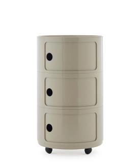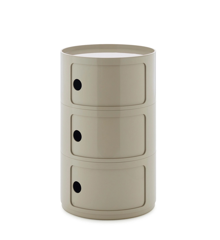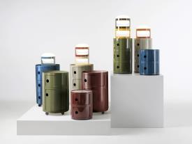 Présentés ici dans une version ronde de 42 cm, les Componibili d’Anna Castelli Ferrieri apparaissent sous un jour totalement nouveau. Une nouvelle apparence obtenue en utilisant un nouveau moule industriel qui met en valeur sa qualité et son esthétique. La palette s’enrichit de coloris déjà proposés pour la version de 32 cm, auxquels s’ajoutent des nuances inédites, où le style contemporain dialogue avec d’élégantes références au passé. Disponible avec 2 ou 3 éléments indissociables, cette nouveauté représente une évolution technique prête à valoriser un classique du catalogue. Disponibles dans les couleurs : bordeaux, gris tourterelle, orange, bleu pétrole, vert et blanc