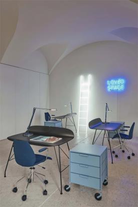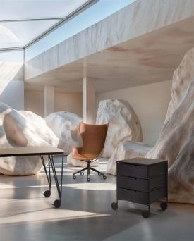 Vainqueur du Compas d’or en 1994, le système de rangement Mobil est présenté en version mate dans les couleurs blanc, noir, vert, prune et bleu ciel. La nouvelle édition est en matériau recyclé issu du tri industriel et conserve les mêmes caractéristiques de résistance et fonctionnalité que la version originale. L’élément de base du système est le tiroir, alterné avec les étagères et les parties supérieures, tous reliés par une structure en aluminium. Dans cette nouvelle finition, la structure ainsi que les roues sont colorées en noir et non plus en gris. Initialement pensé pour le bureau, Mobil saura s’intégrer dans toutes les pièces de la maison, que cela soit la chambre à coucher, le séjour ou la salle de bains.
